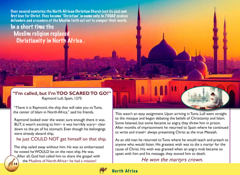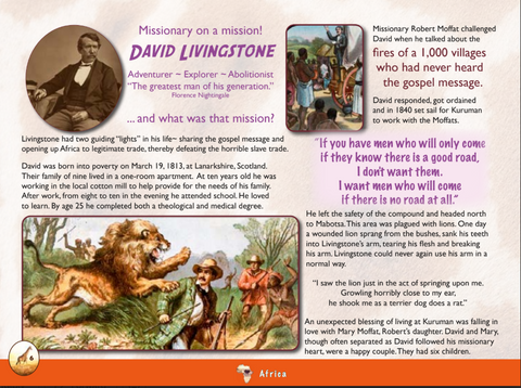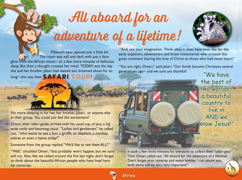 Africa!! How exciting and sometimes scary. Our friends began their whirlwind journey through Africa in the north, where there are many Arab people. Itβs also where many Biblical events took place. How exciting it was to see elephants, rhinos and giraffes as they took a safari through middle Africa. Meeting the tribes of South Africa was fascinating. ALL of Africa had awesome and amazing stories of very brave missionaries who helped shine the light of the gospel on to what used to be called βThe Dark Continent."